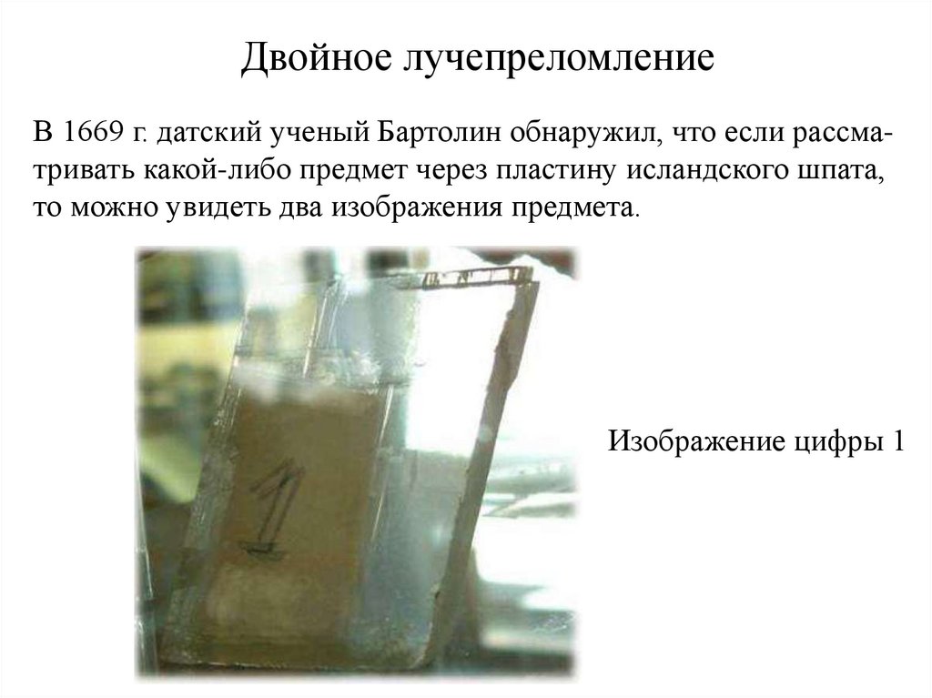 Двойное лучепреломлениеВ 1669 г. датский ученый Бартолин обнаружил, что если рассматривать какой-либо предмет через пластину исландского шпата,