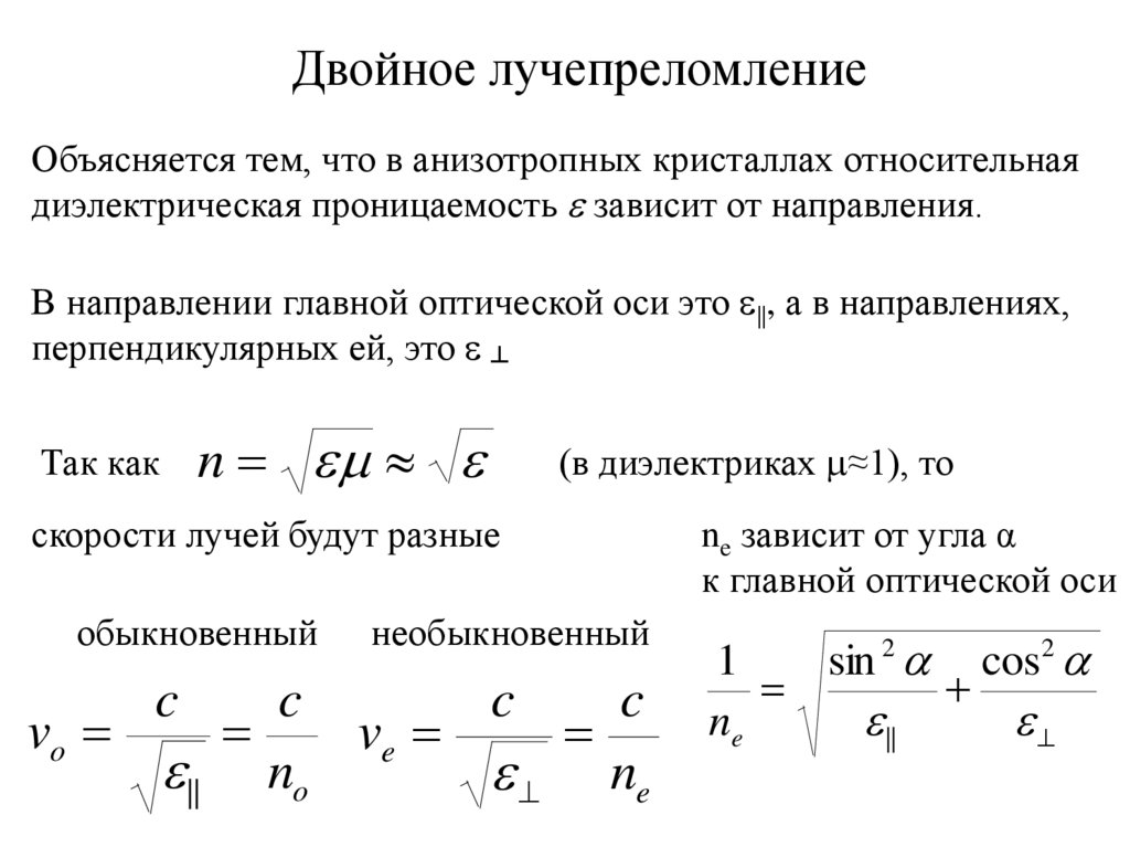 Двойное лучепреломлениеОбъясняется тем, что в анизотропных кристаллах относительная
