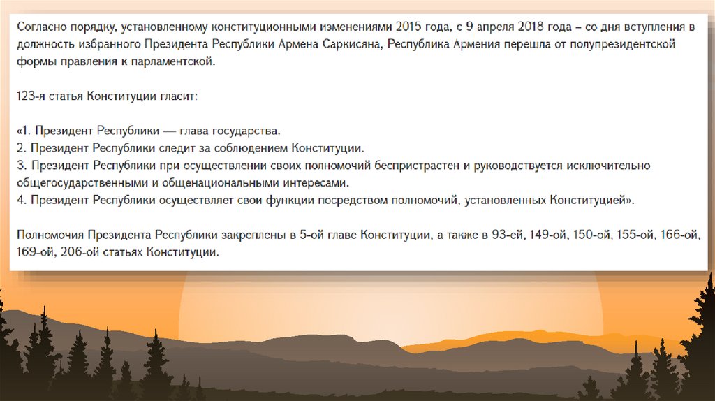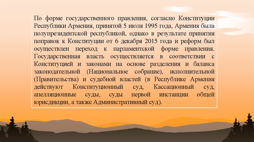 По форме государственного правления, согласно КонституцииРеспублики Армения, принятой 5 июля 1995 года, Армения была