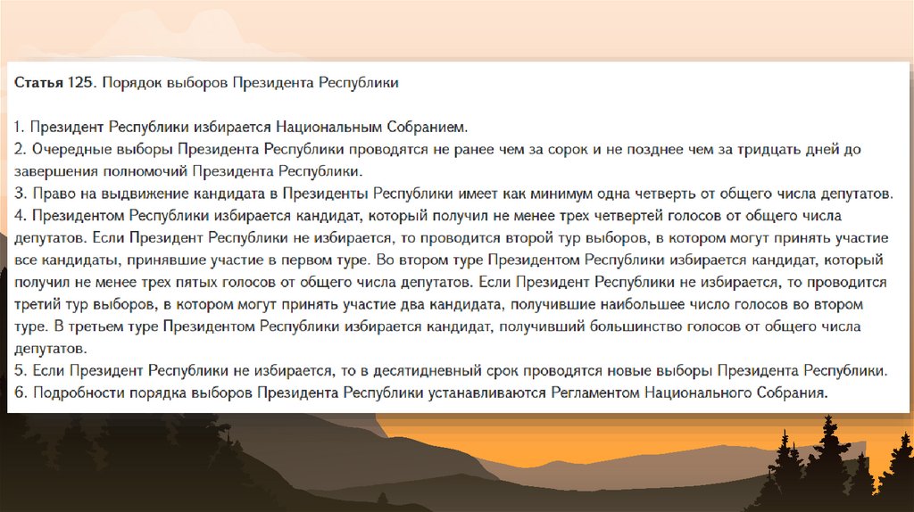 Избранного парламентским большинством кандидата Президент Республики назначает Премьер-министром.