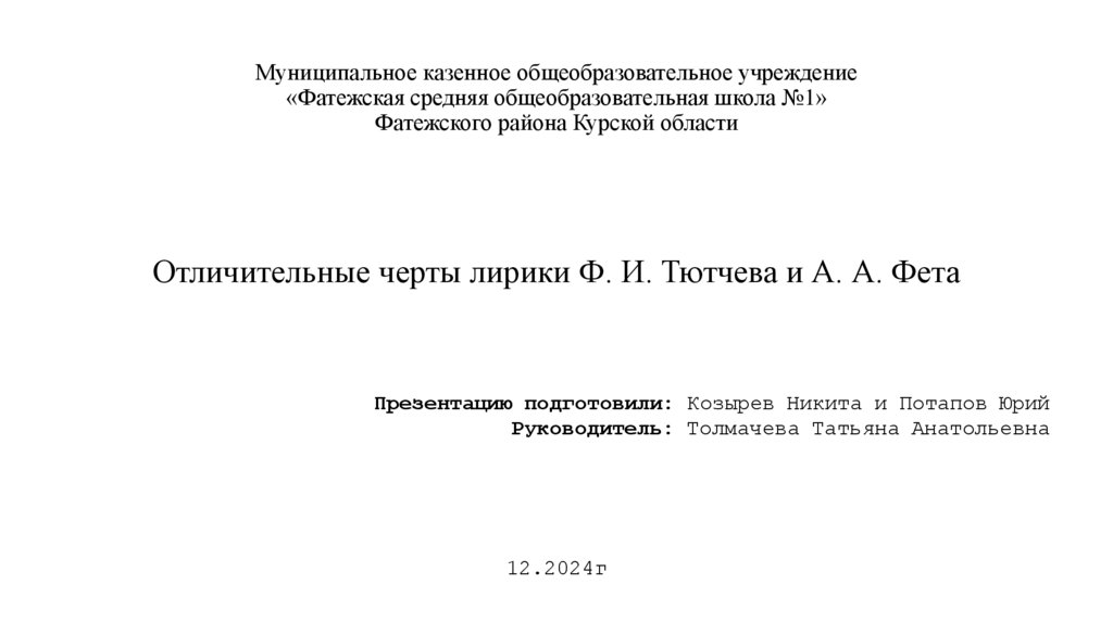 Курской областиОтличительные черты лирики Ф. И. Тютчева и А. А. Фета