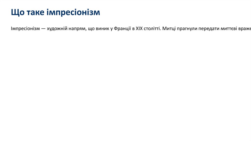 Що таке імпресіонізмІмпресіонізм — художній напрям, що виник у Франції в XIX столітті. Митці прагнули передати миттєві враже