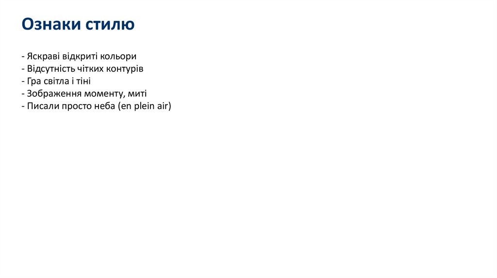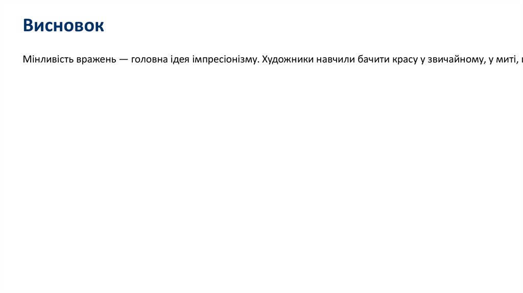 ВисновокМінливість вражень — головна ідея імпресіонізму. Художники навчили бачити красу у звичайному, у миті, щ