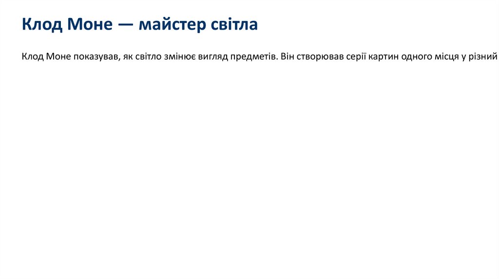 Клод Моне — майстер світлаКлод Моне показував, як світло змінює вигляд предметів. Він створював серії картин одного місця у різний
