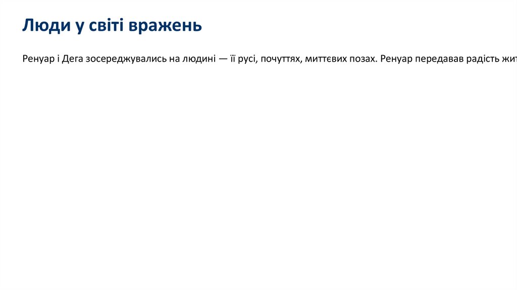 Люди у світі враженьРенуар і Дега зосереджувались на людині — її русі, почуттях, миттєвих позах. Ренуар передавав радість жит