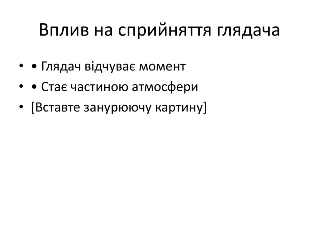 Вплив на сприйняття глядача• • Глядач відчуває момент