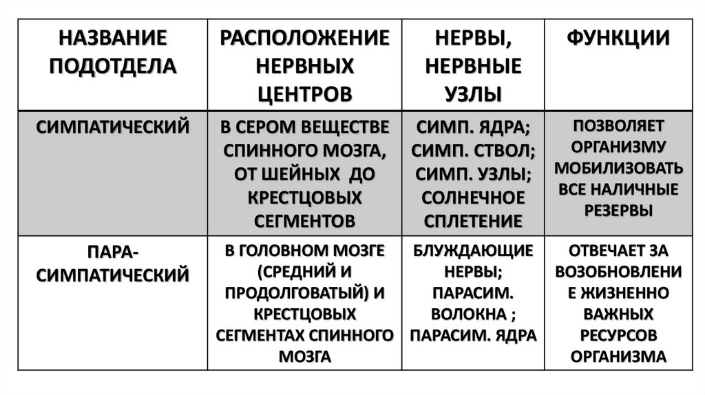 ПАРАСИМПАТИЧЕСКОГО ПОДОТДЕЛОВ