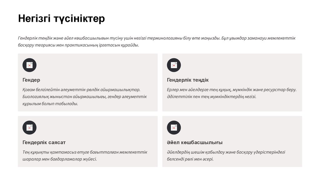 Негізгі түсініктерГендерлік теңдік және әйел көшбасшылығын түсіну үшін негізгі терминологияны білу өте маңызды. Бұл ұғымдар заманауи мемлекеттік