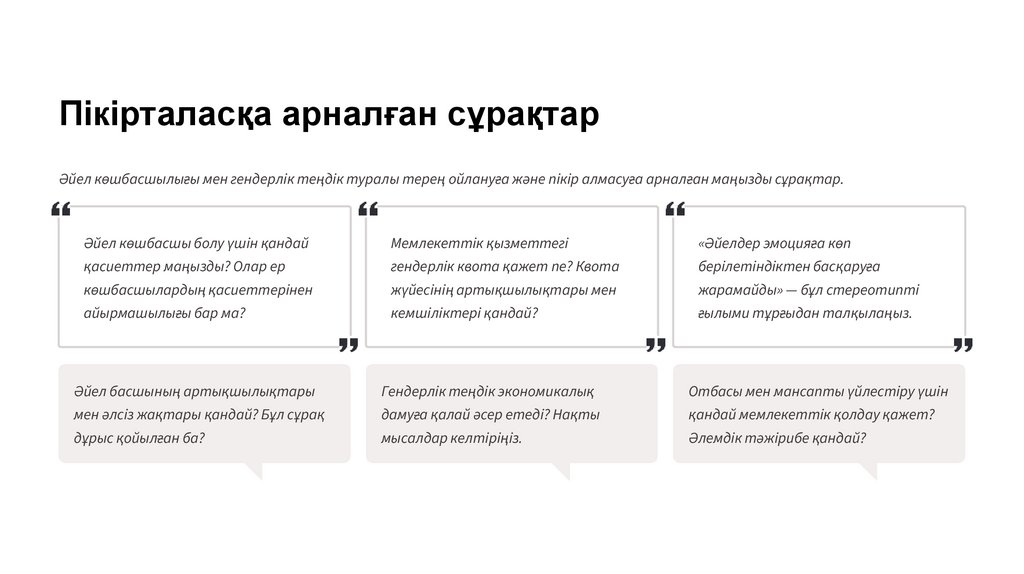 Пікірталасқа арналған сұрақтарӘйел көшбасшылығы мен гендерлік теңдік туралы терең ойлануға және пікір алмасуға арналған маңызды сұрақтар.