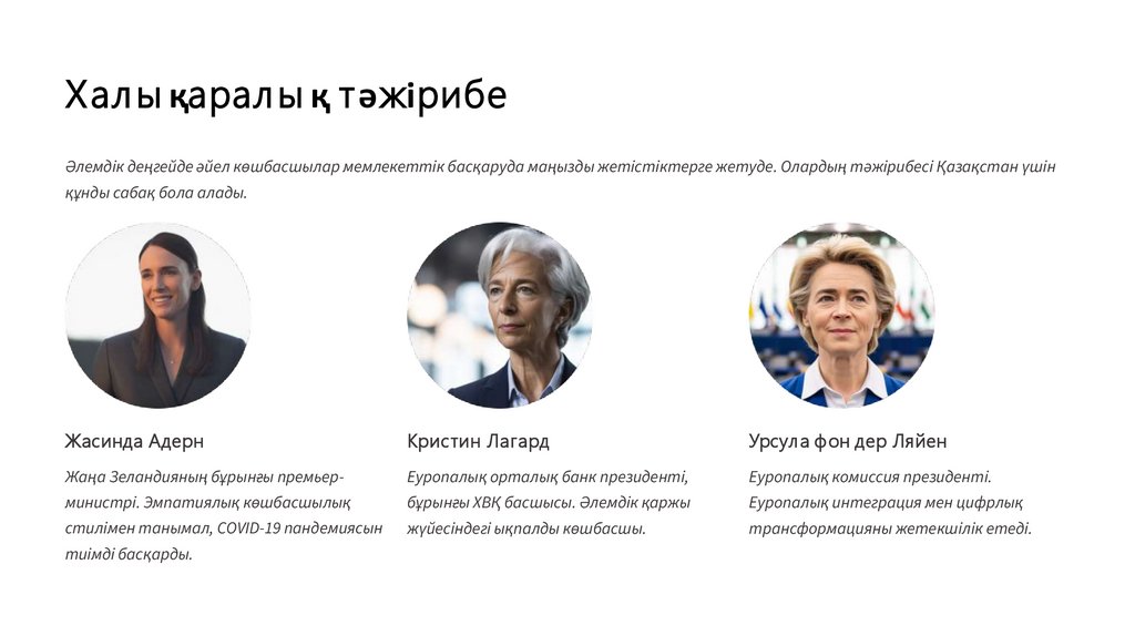 Хал ы қарал ы қ тәжірибеӘлемдік деңгейде әйел көшбасшылар мемлекеттік басқаруда маңызды жетістіктерге жетуде. Олардың тәжірибесі Қазақстан үшін