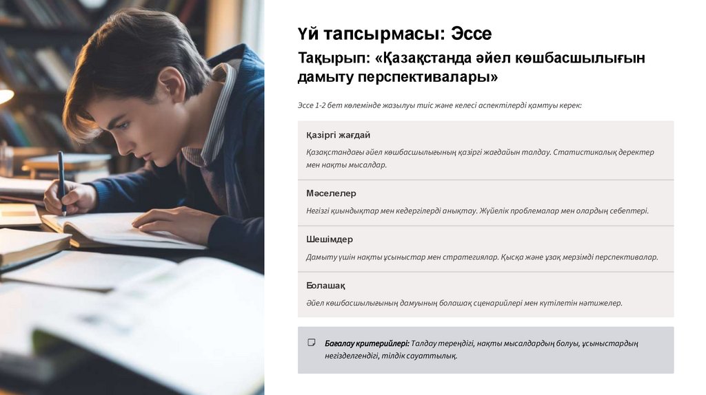 Үй тапсырмасы: ЭссеТақырып: «Қазақстанда әйел көшбасшылығын
