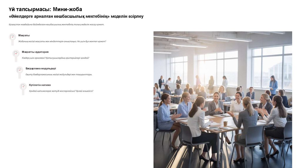 Үй тапсырмасы: Мини-жоба«Әйелдерге арналған көшбасшылық мектебінің» моделін әзірлеу