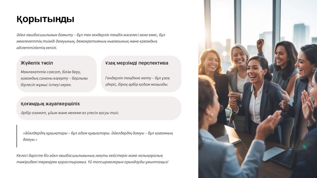 ҚорытындыӘйел көшбасшылығын дамыту – бұл тек гендерлік теңдік мәселесі ғана емес, бұл