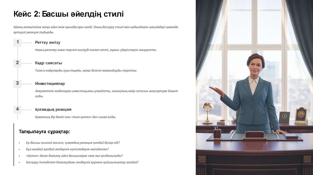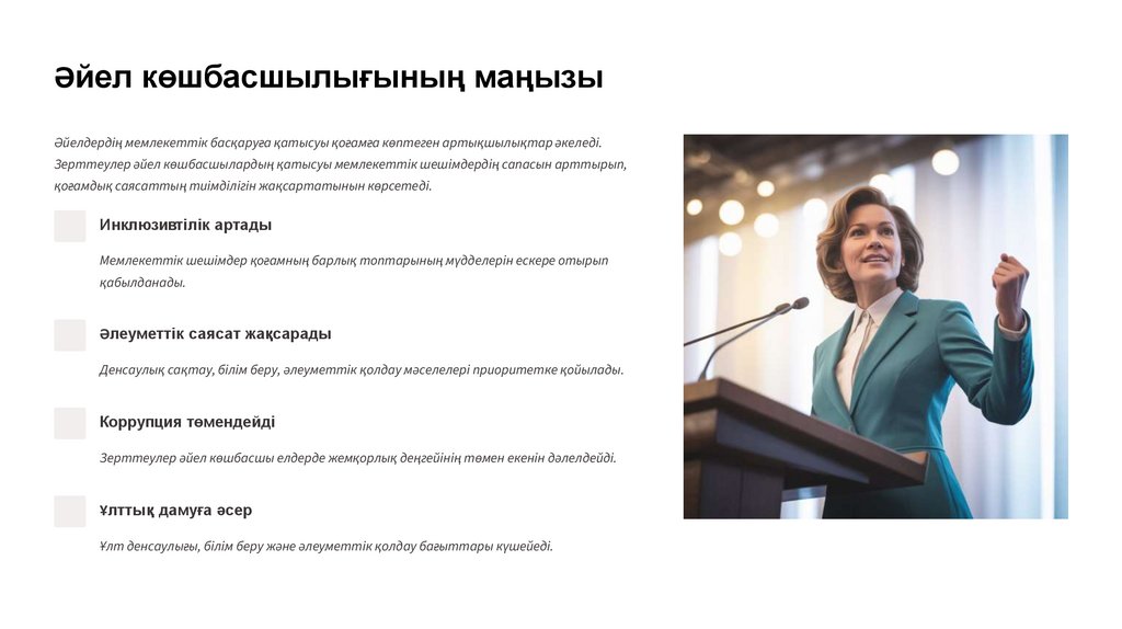 Әйел көшбасшылығының маңызыӘйелдердің мемлекеттік басқаруға қатысуы қоғамға көптеген артықшылықтар әкеледі.