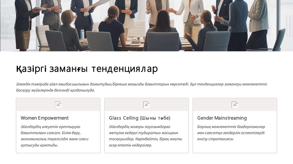 Қазіргі заманғы тенденциял арӘлемдік тәжірибе әйел көшбасшылығын дамытудың бірнеше маңызды бағыттарын көрсетеді. Бұл тенденциялар заманауи мемлекеттік