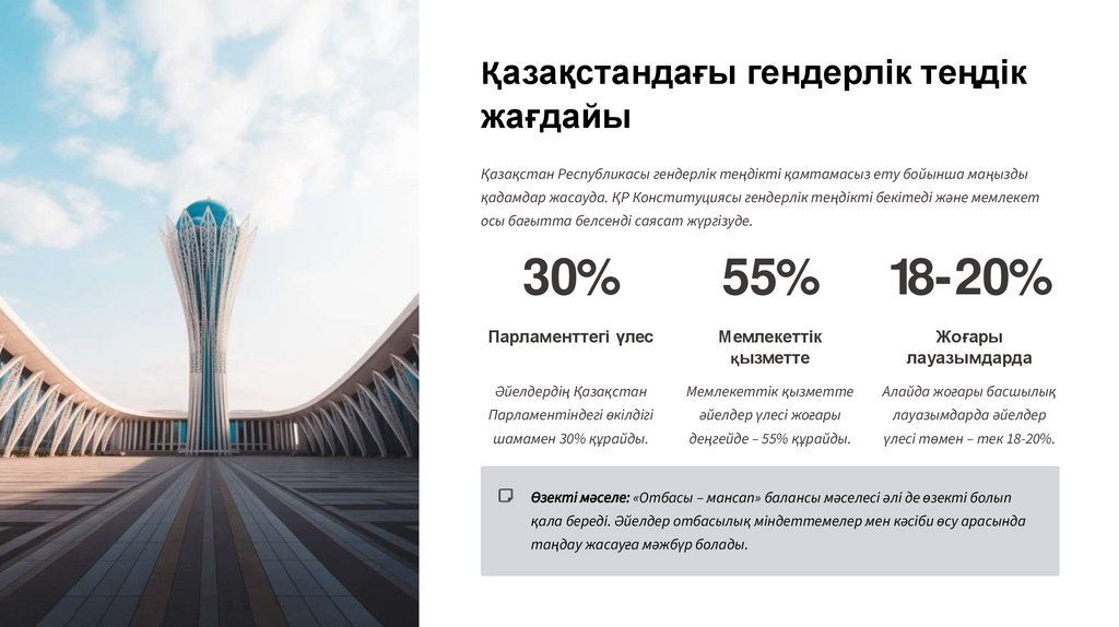 қадамдар жасауда. ҚР Конституциясы гендерлік теңдікті бекітеді және мемлекет