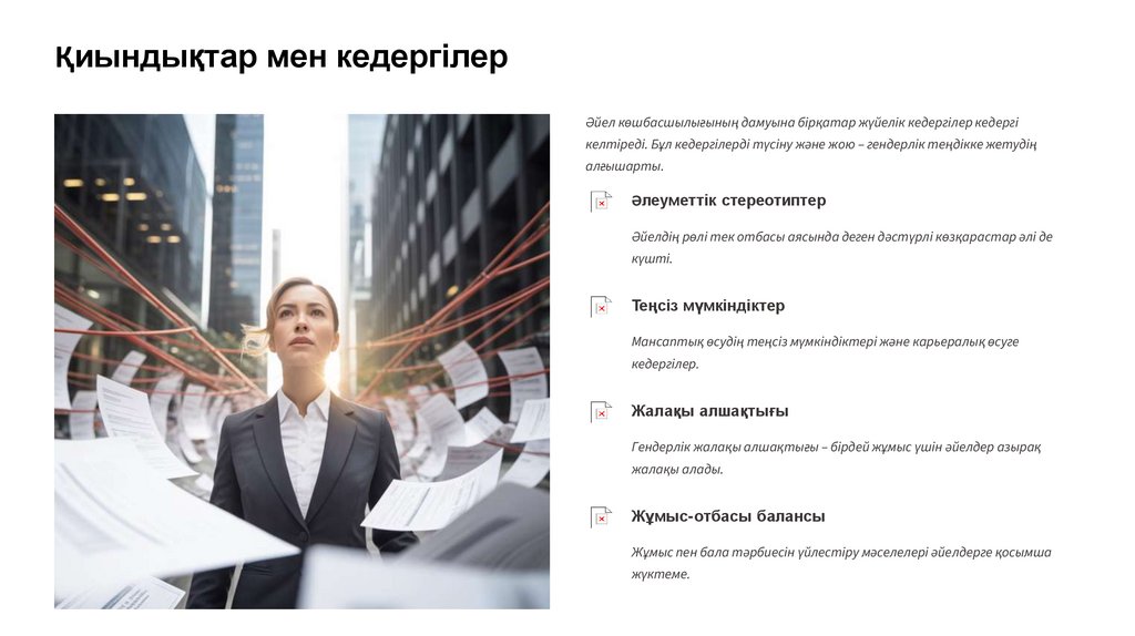 Қиындықтар мен кедергілерӘйел көшбасшылығының дамуына бірқатар жүйелік кедергілер кедергі