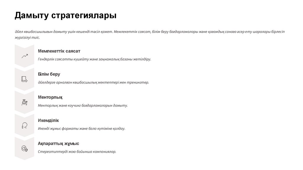 Дамыту стратегияларыӘйел көшбасшылығын дамыту үшін кешенді тәсіл қажет. Мемлекеттік саясат, білім беру бағдарламалары және қоғамдық санаға әсер ету шаралары бірлесіп