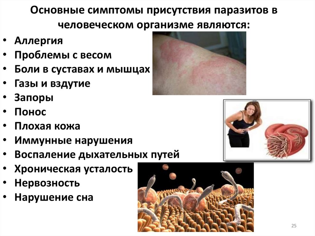 Основные симптомы присутствия паразитов вчеловеческом организме являются:
