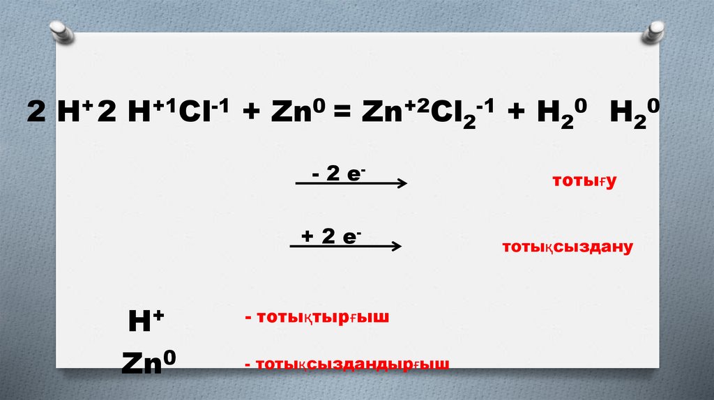 2 H+ 2 H+1Cl-1 + Zn0 = Zn+2Cl2-1 + H20 H20- 2 е+ 2 е-