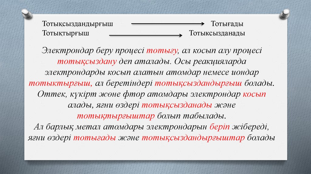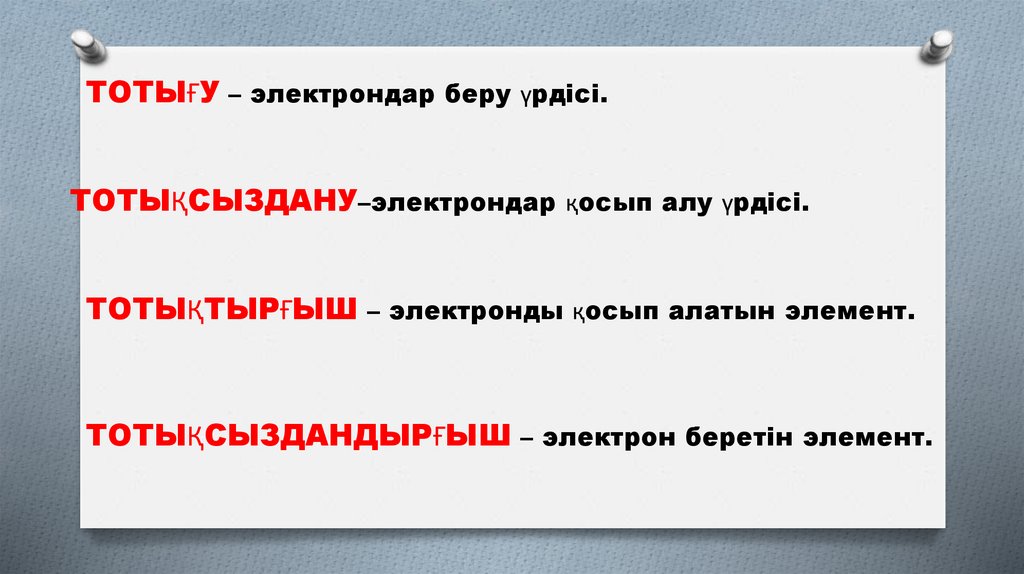 ТОТЫҒУ – электрондар беру үрдісі.ТОТЫҚСЫЗДАНУ–электрондар қосып алу үрдісі.