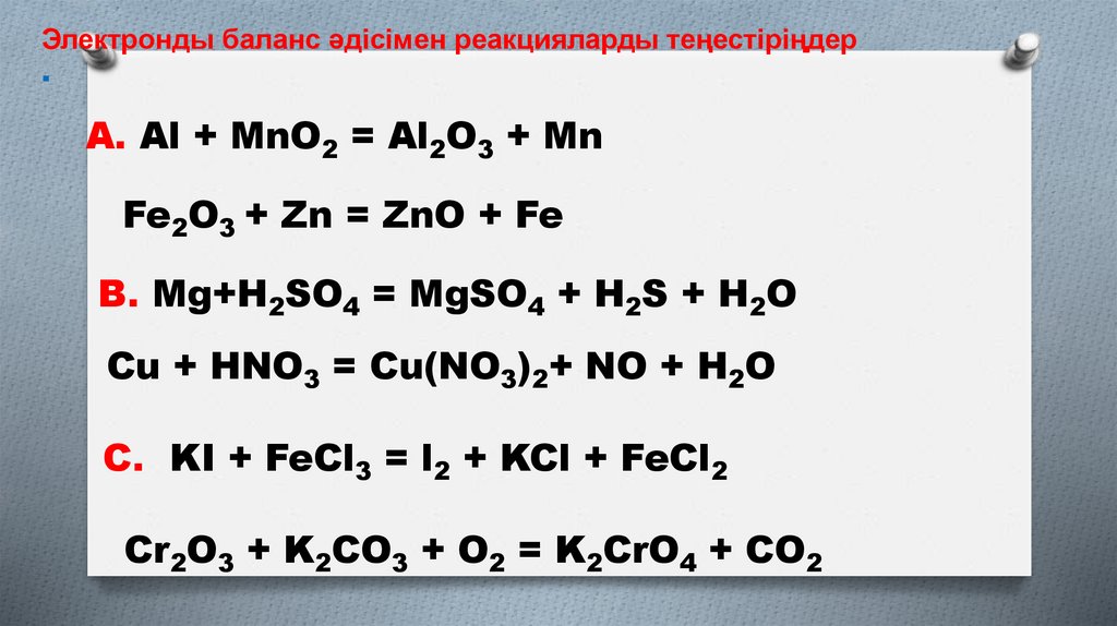Электронды баланс әдісімен реакцияларды теңестіріңдер.