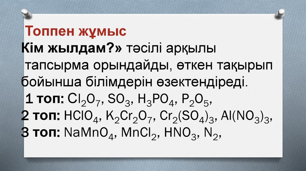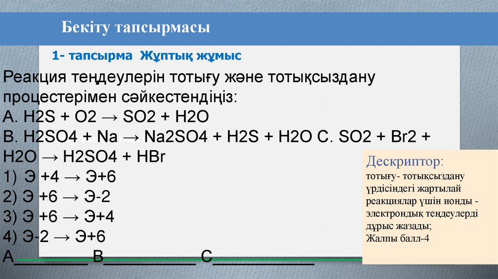 24. 3-тапсырма Жұптық жұмыс Сұрақ 1: ТТР- реакцияға қатысушы заттардың құрамындағы элементі тотығу дәрежелерінің өзгеруімен жүретін
