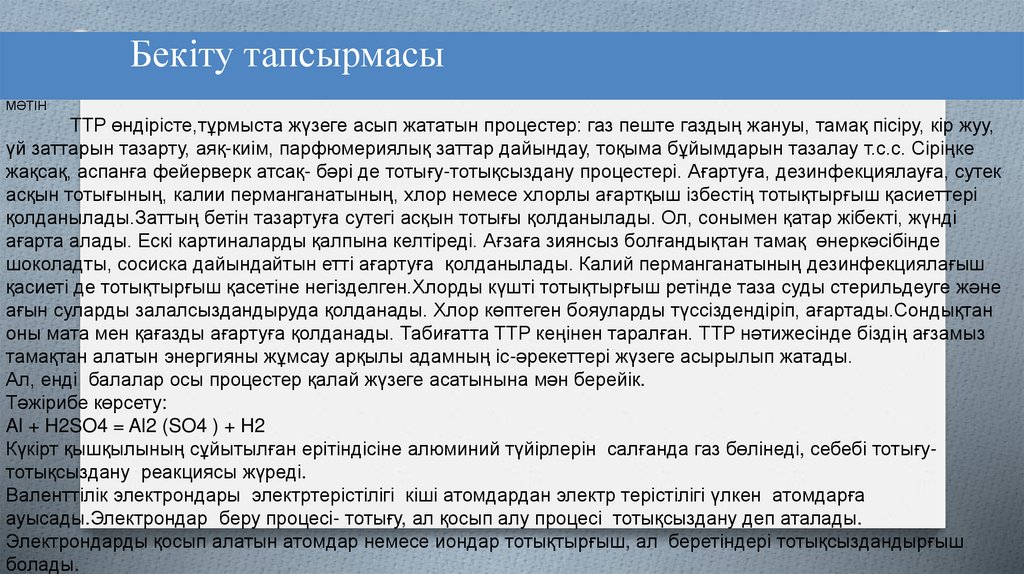 жақсақ, аспанға фейерверк атсақ- бәрі де тотығу-тотықсыздану процестері. Ағартуға, дезинфекциялауға, сутек