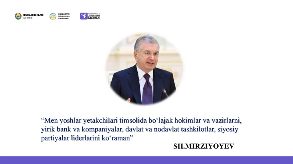 “Men yoshlar yetakchilari timsolida bo‘lajak hokimlar va vazirlarni,yirik bank va kompaniyalar, davlat va nodavlat tashkilotlar, siyosiy