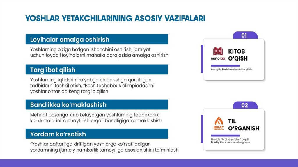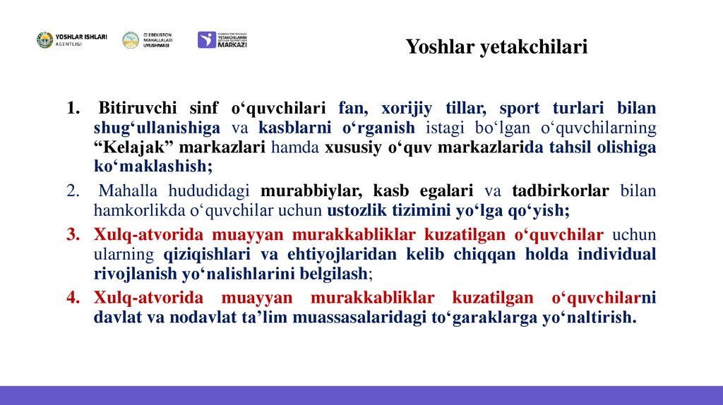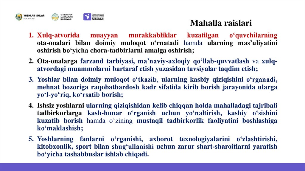 6. Yoshlar yetakchilarining funksional vazifalari va majburiyatlari;