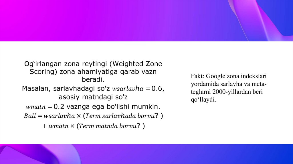 • Axborot izlash tizimlarida hujjatlarni tegishlilik darajasi bo‘yicha baholash.