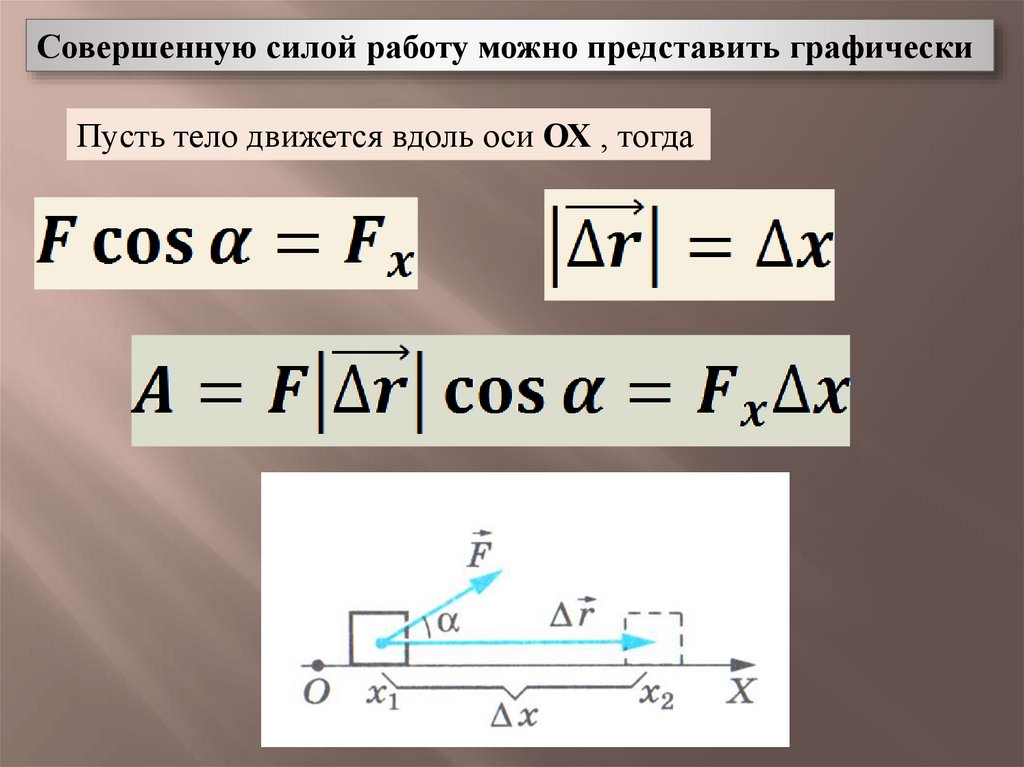 Совершенную силой работу можно представить графическиПусть тело движется вдоль оси ОХ , тогда