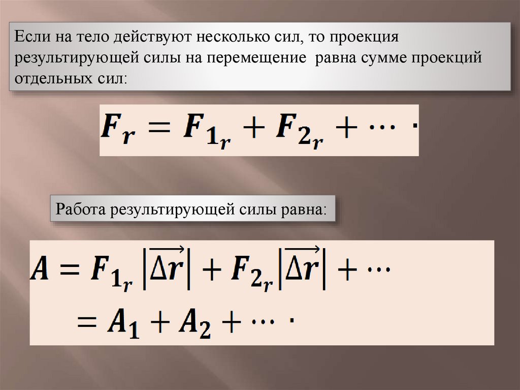 Если на тело действуют несколько сил, то проекциярезультирующей силы на перемещение равна сумме проекций