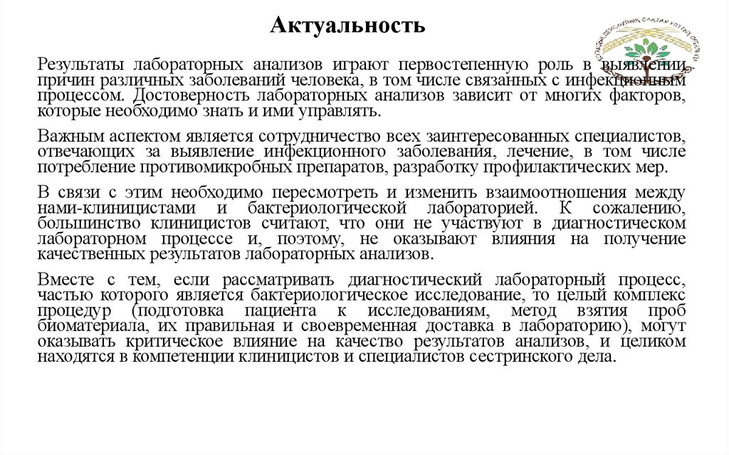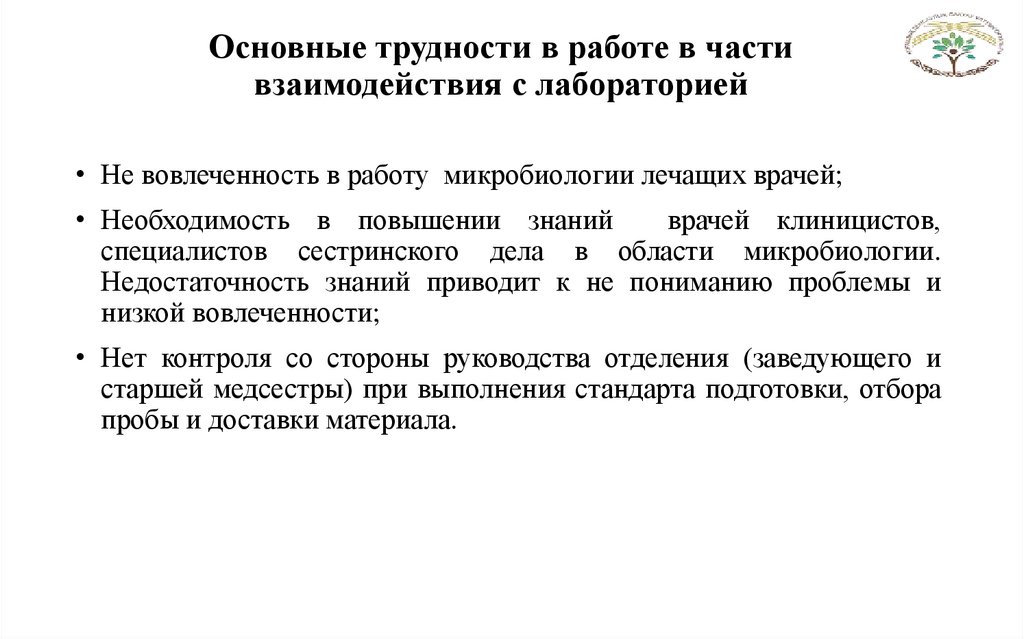 • Не вовлеченность в работу микробиологии лечащих врачей;• Необходимость в повышении знаний