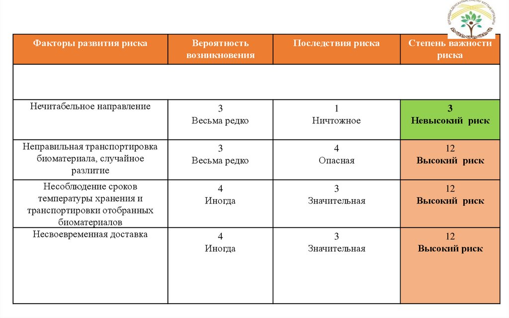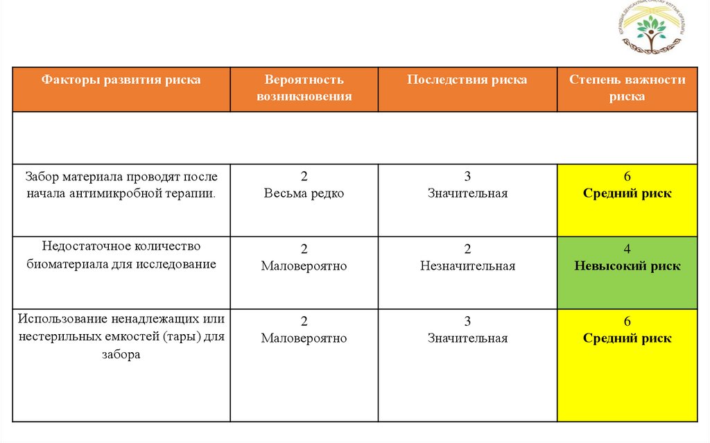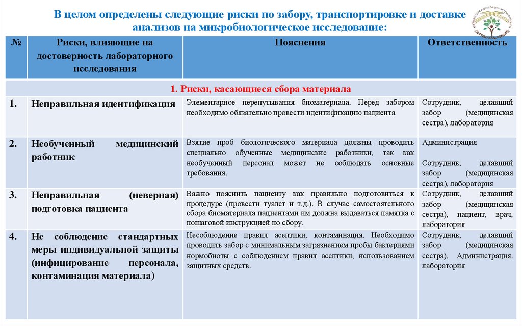1. Определить риски, касающиеся сбора, транспортировки идоставка анализов на микробиологические исследования,