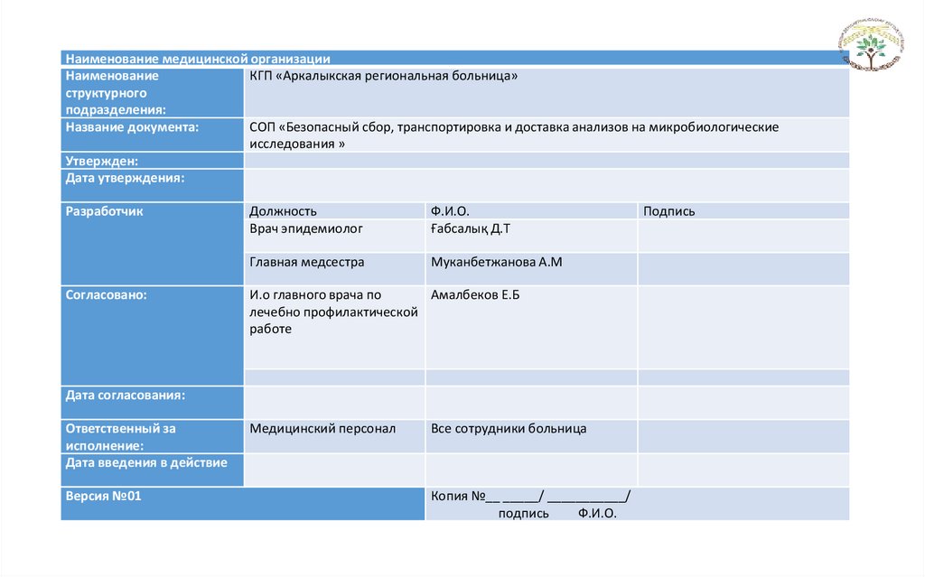 процедуру (СОП) «Безопасный сбор, транспортировка и доставка