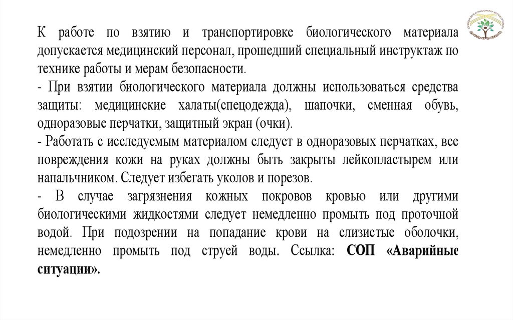 • Все емкости для сбора и транспортировки биоматериала должны быть