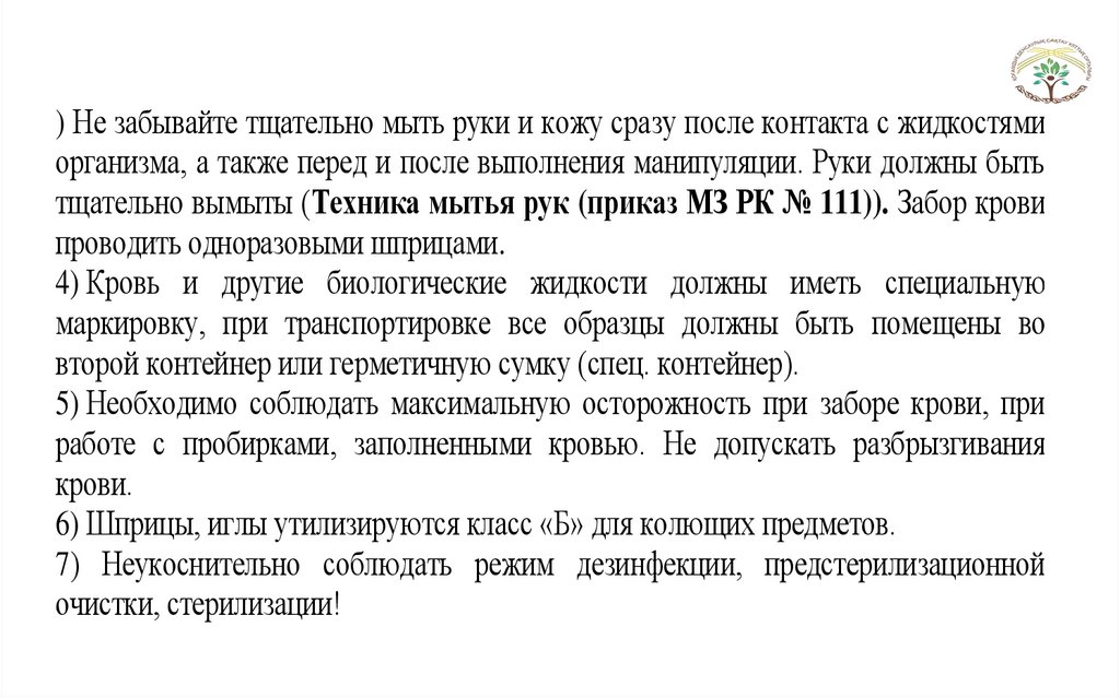 тщательно вымыты (Техника мытья рук (приказ МЗ РК № 111)). Забор крови