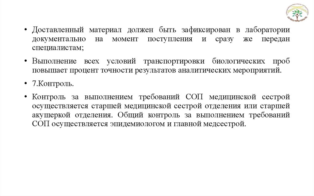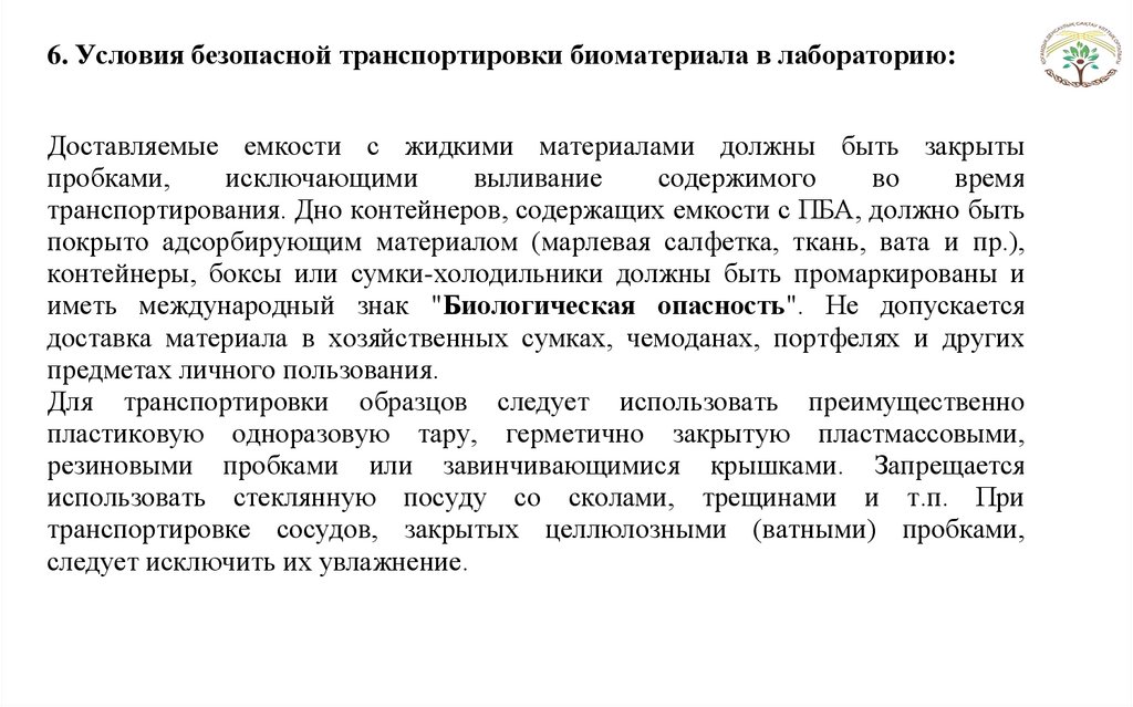 6. Условия безопасной транспортировки биоматериала в лабораторию:Доставляемые емкости с жидкими материалами должны быть закрыты