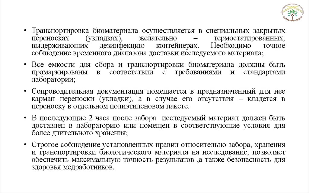• Транспортировка биоматериала осуществляется в специальных закрытыхпереносках