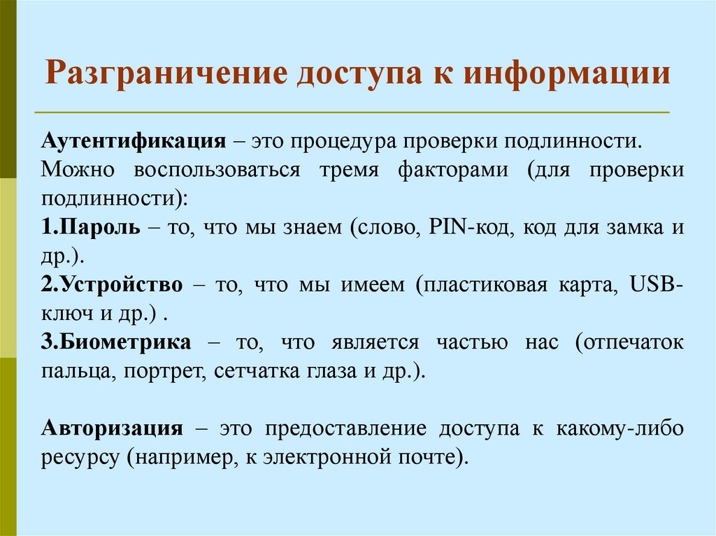 Аутентификация – это процедура проверки подлинности.Можно воспользоваться тремя факторами (для проверки