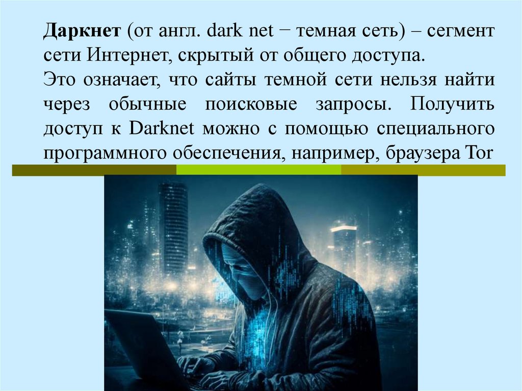 Даркнет (от англ. dark net − темная сеть) – сегментсети Интернет, скрытый от общего доступа.