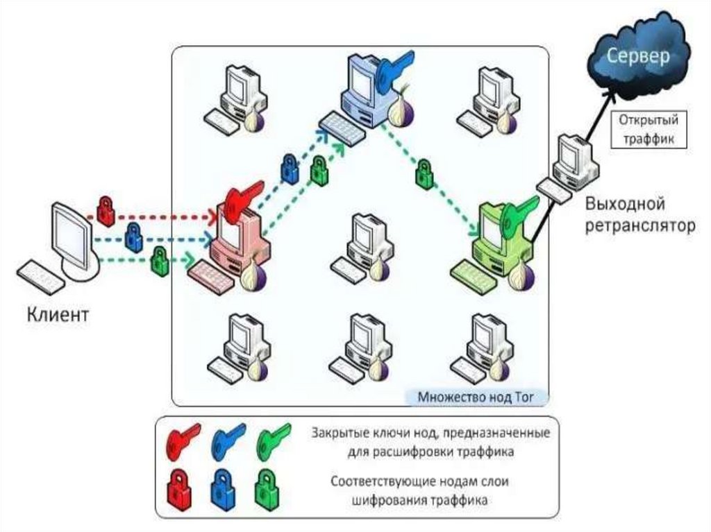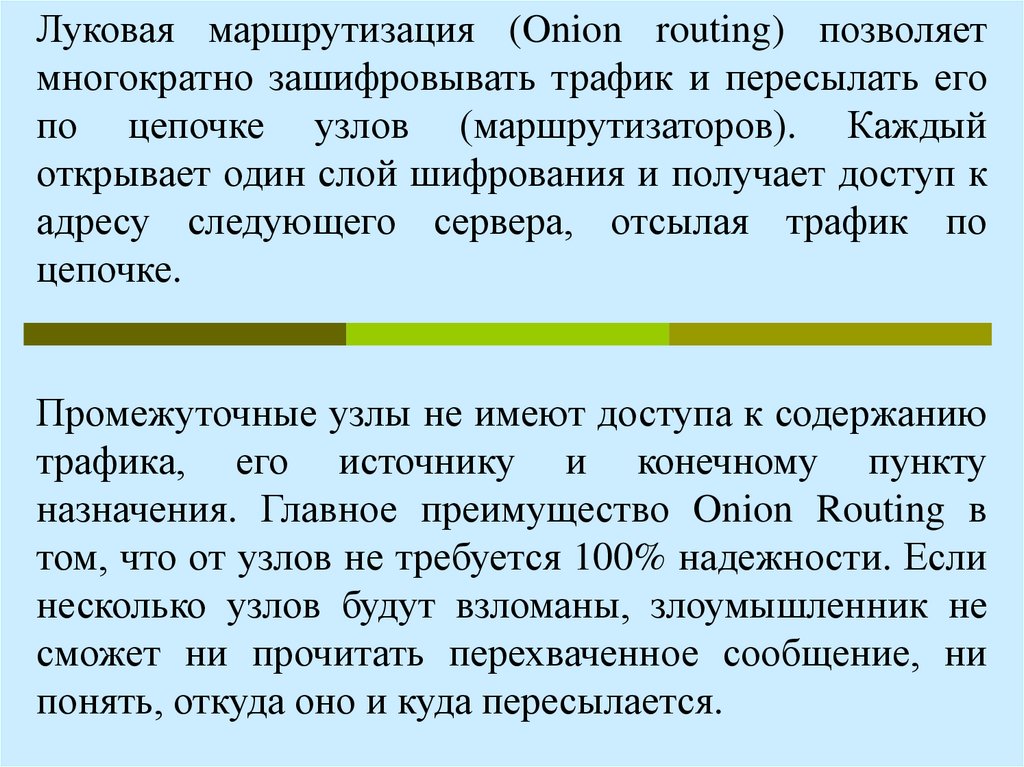 Луковая маршрутизация (Onion routing) позволяетмногократно зашифровывать трафик и пересылать его