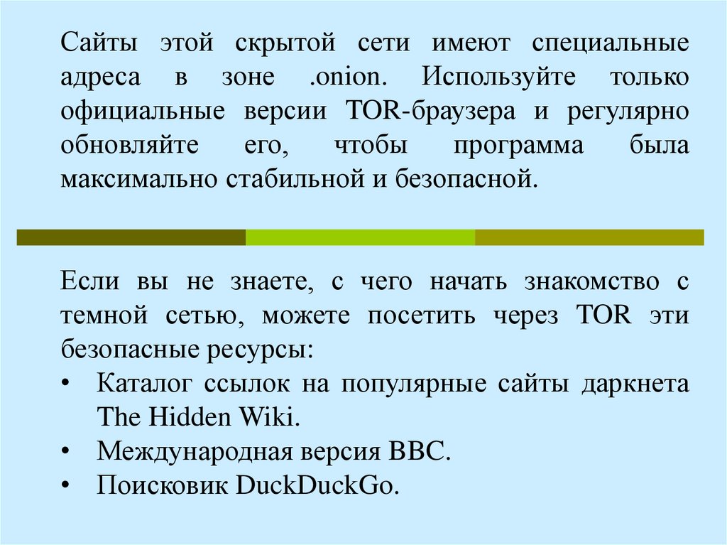Сайты этой скрытой сети имеют специальныеадреса в зоне .onion. Используйте только