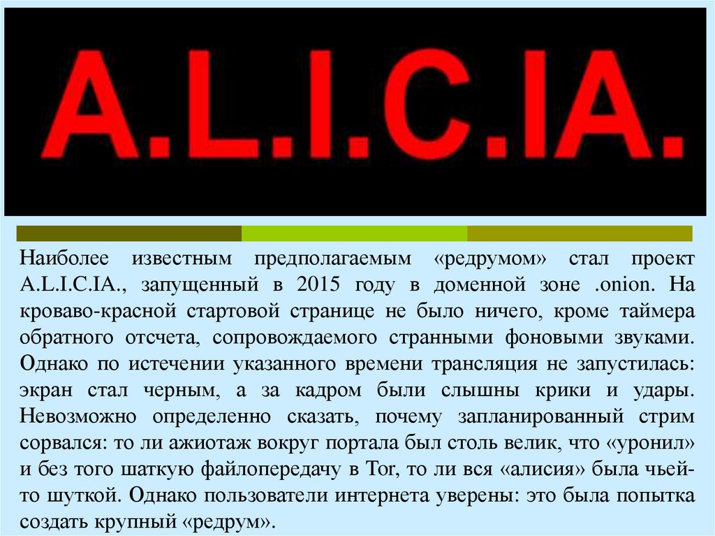 Наиболее известным предполагаемым «редрумом» стал проектA.L.I.C.IA., запущенный в 2015 году в доменной зоне .onion. На