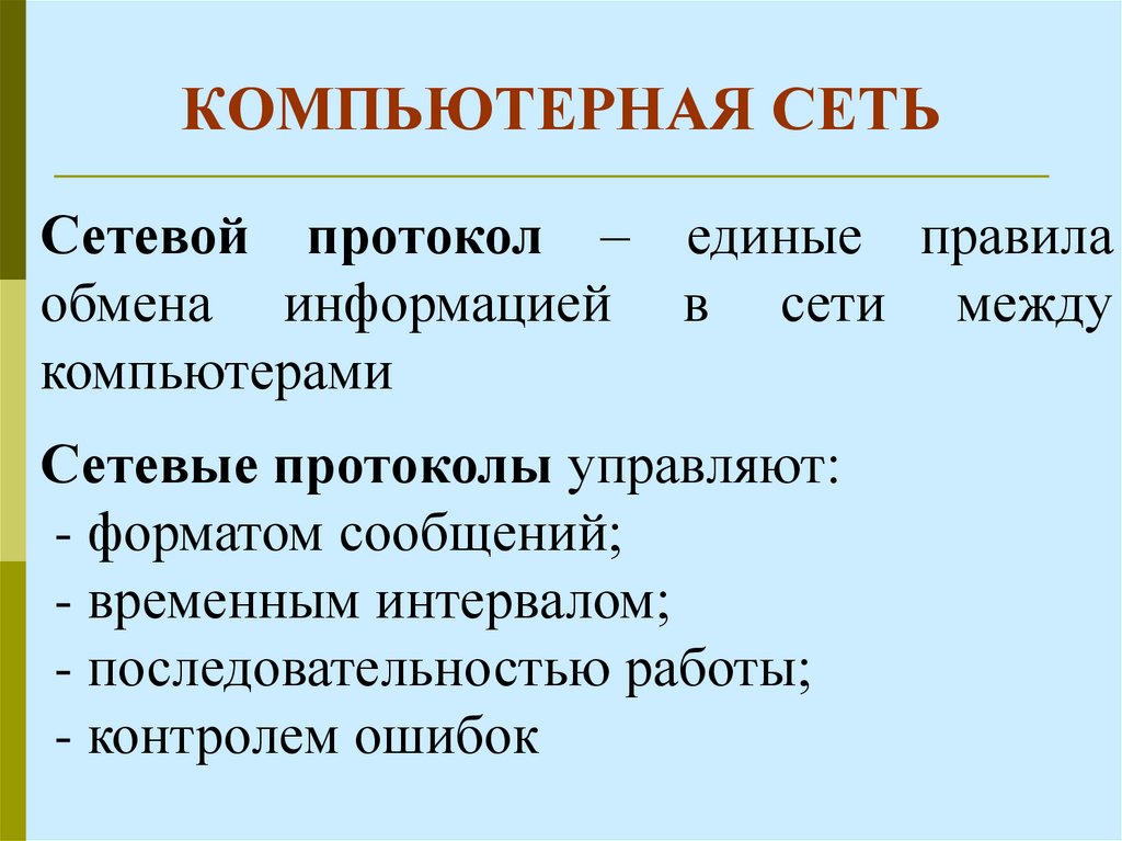 Сетевой протокол – единые правилаобмена информацией в сети между