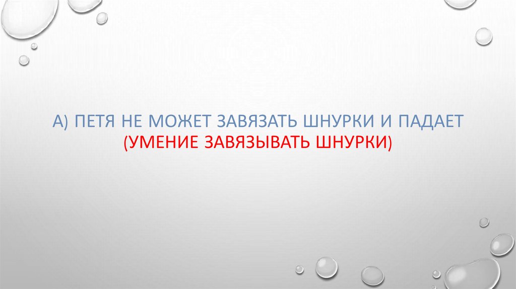 А) ПЕТЯ НЕ МОЖЕТ ЗАВЯЗАТЬ ШНУРКИ И ПАДАЕТ(УМЕНИЕ ЗАВЯЗЫВАТЬ ШНУРКИ)