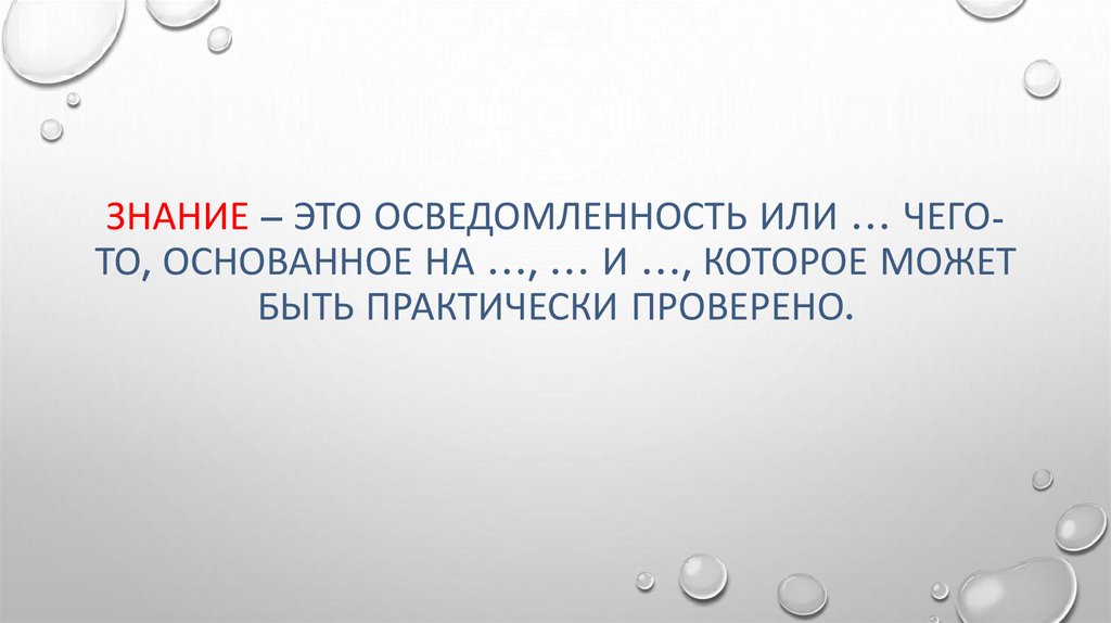 ЗНАНИЕ – ЭТО ОСВЕДОМЛЕННОСТЬ ИЛИ … ЧЕГОТО, ОСНОВАННОЕ НА …, … И …, КОТОРОЕ МОЖЕТБЫТЬ ПРАКТИЧЕСКИ ПРОВЕРЕНО.