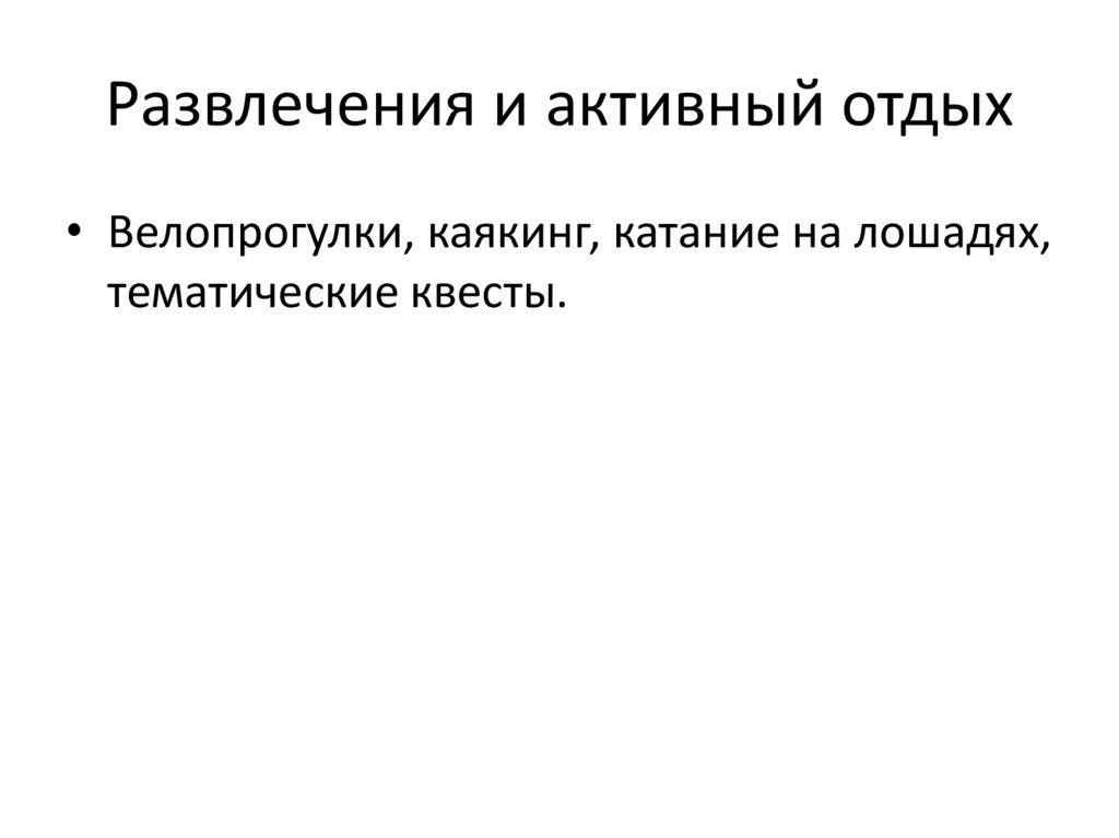 Развлечения и активный отдых• Велопрогулки, каякинг, катание на лошадях,