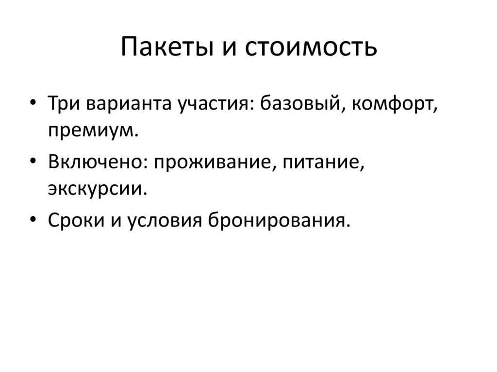 Пакеты и стоимость• Три варианта участия: базовый, комфорт,